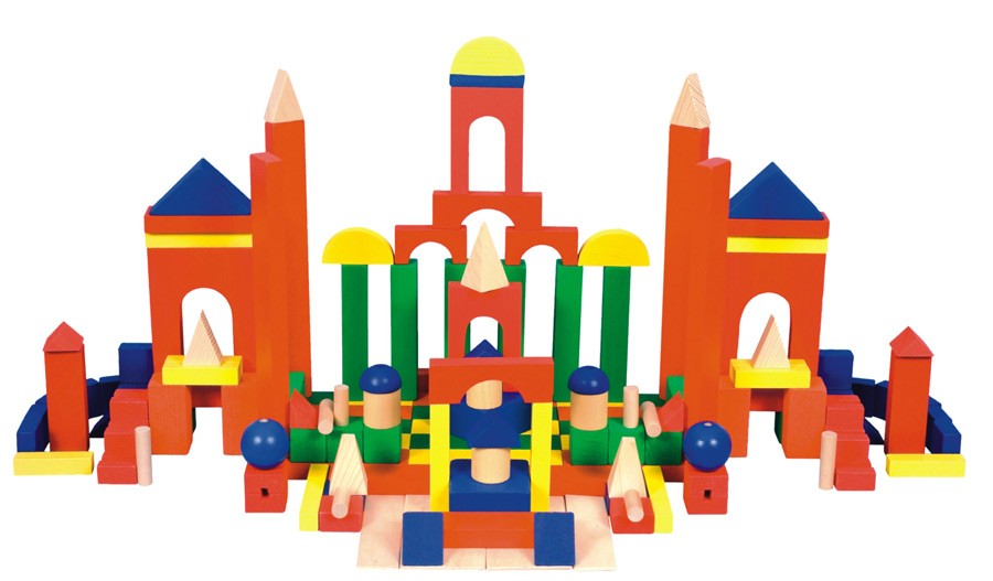 Строительный набор включает в себя огромное количество цветных деталей различных геометрических форм: кубики, бруски разных размеров, пластины, призмы, усеченные призмы, цилиндры, полуцилиндры, шары, полусферы.